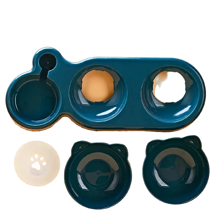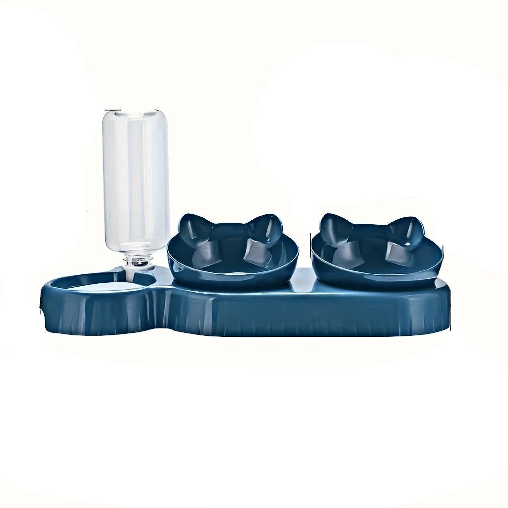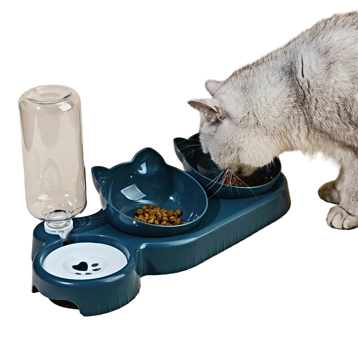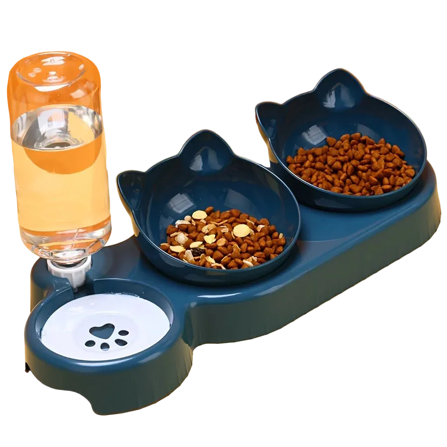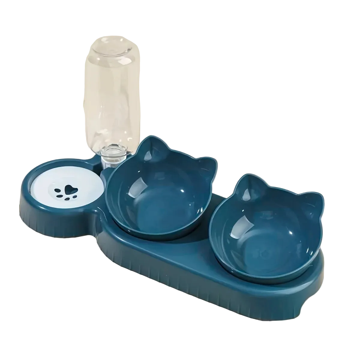 O design arredondado com comedouro inclinado melhora a postura durante a refeição, enquanto o bebedouro com sistema de gravidade garante hidratação contínua sem necessidade de reposição constante.